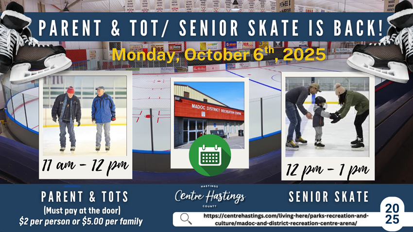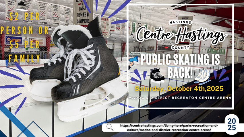 Lace your skates and join us for some fun at the Madoc & District Recreational Centre! Bring your family and friends for a great time on the ice.