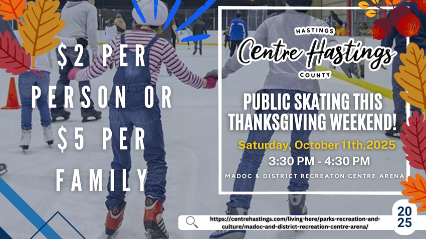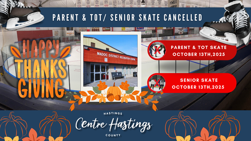 Please be advised that the Parent & Tot and Senior Skate sessions scheduled for Monday, October 13th, 2025, at the Madoc & District Recreational Centre Arena are cancelled due to the Thanksgiving Holiday.