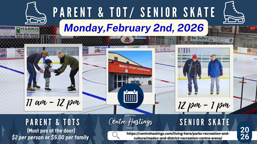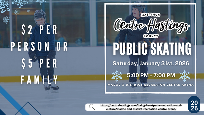 Looking for some winter fun? Grab your skates and join us for public skating at the Madoc & District Recreation Centre Arena on the following Saturdays: