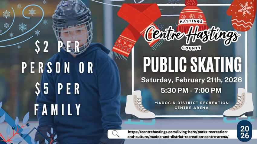 Winter is at its best when you’re skating! Come to the Madoc and District Recreation Centre Arena this Saturday, February 20th, 2026, 5:30 PM – 7:00 PM.