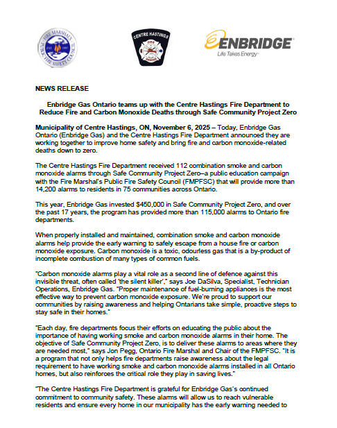 NEWS RELEASE:Enbridge Gas Ontario teams up with the Centre Hastings Fire Department to Reduce Fire and Carbon Monoxide Deaths through Safe Community Project Zero Municipality of Centre Hastings, ON, November 6, 2025