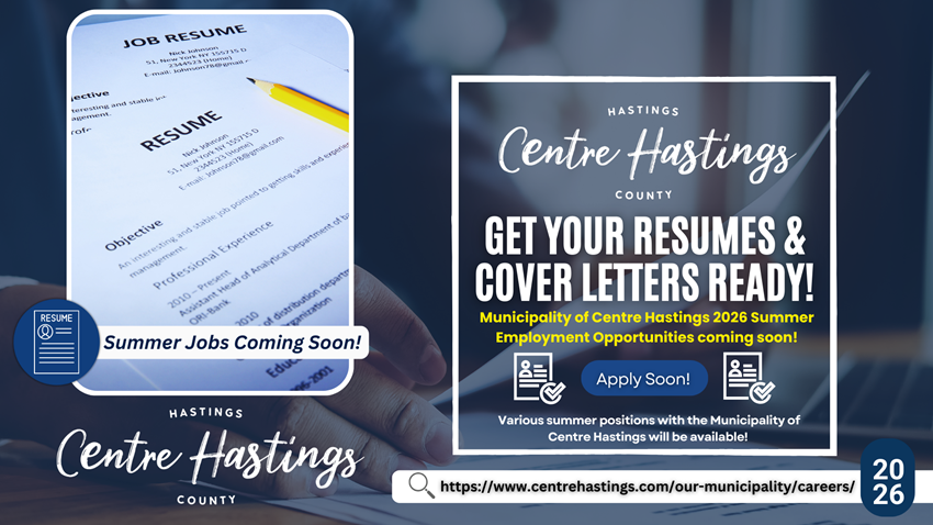 The Municipality of Centre Hastings is excited to announce that summer student job opportunities will be opening soon! A variety of summer positions across municipal departments will be available, offering a great chance to gain hands-on experience while supporting your community.