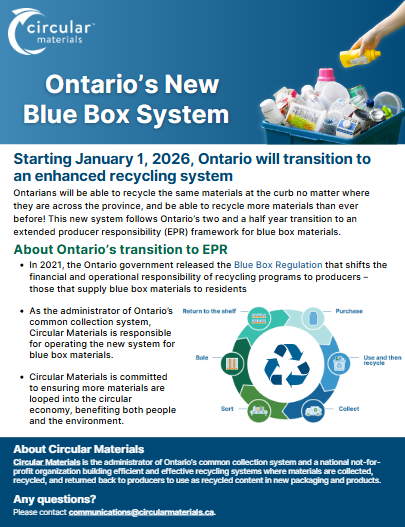 Additional information about the Blue Box Transition Program can be found on the Province of Ontario’s website or by visiting https://www.ontario.ca/laws/regulation/210391
