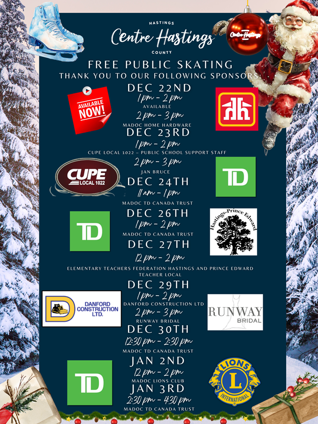 A few skating time slots remain open for businesses or individuals who would like to support free holiday skating and be recognized for their community support.