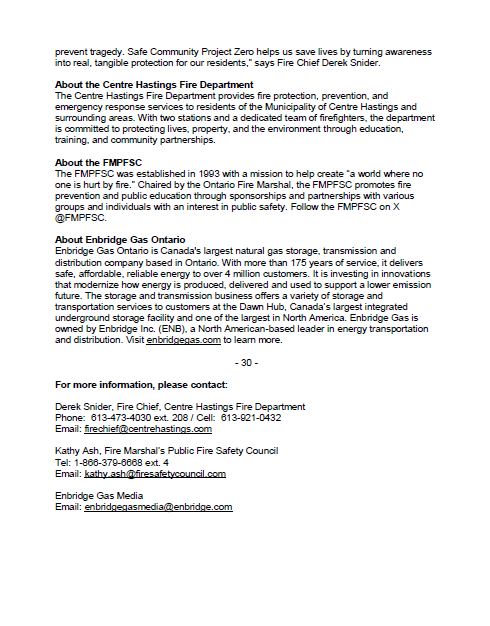 NEWS RELEASE:Enbridge Gas Ontario teams up with the Centre Hastings Fire Department to Reduce Fire and Carbon Monoxide Deaths through Safe Community Project Zero Municipality of Centre Hastings, ON, November 6, 2025