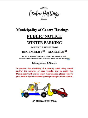 Please be advised that no person shall park a vehicle on any street in the Village of Madoc between the hours of Midnight and 7:00 AM during the winter season.